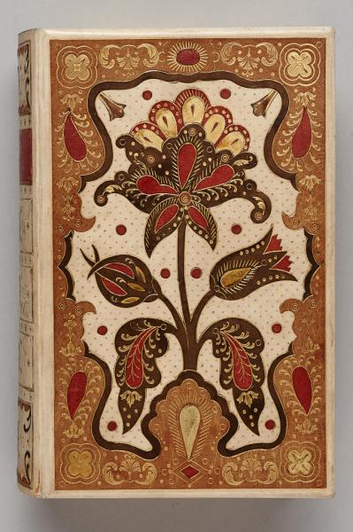 Evelyn Underhill (1875–1941) londoni keresztény misztikus írónő és könyvkötő munkáinak jellegzetessége, hogy a bőrt húsoldalával kifelé használta. A perzsa verseskötetnél szív, madár és rozetta alakú beillesztéseket egyedi nyomóformával keretezte, így alakította ki a motívumok között kanyargó leveles ágakat is.